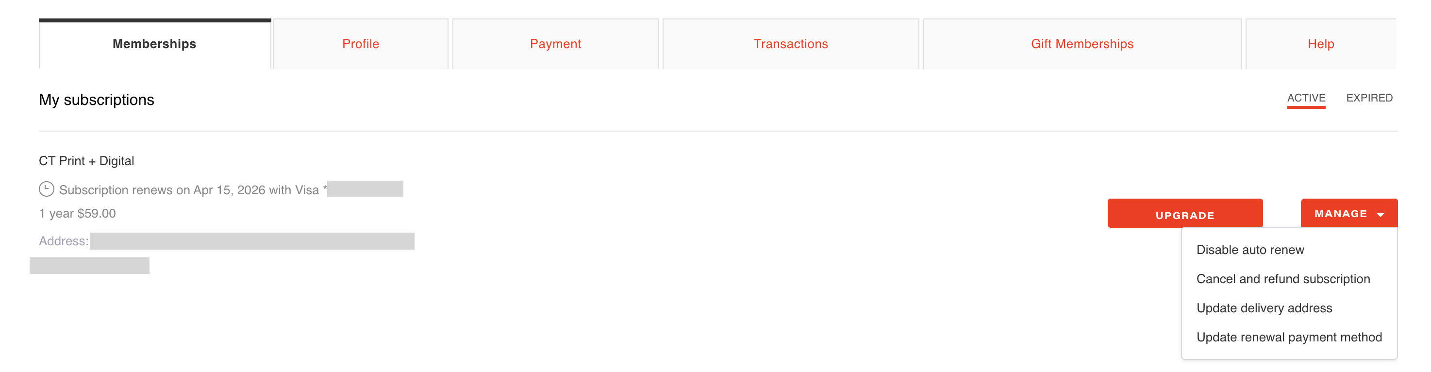 Under the 'Memberships' tab, you can make changes to your delivery address or update payment and renewal preferences: