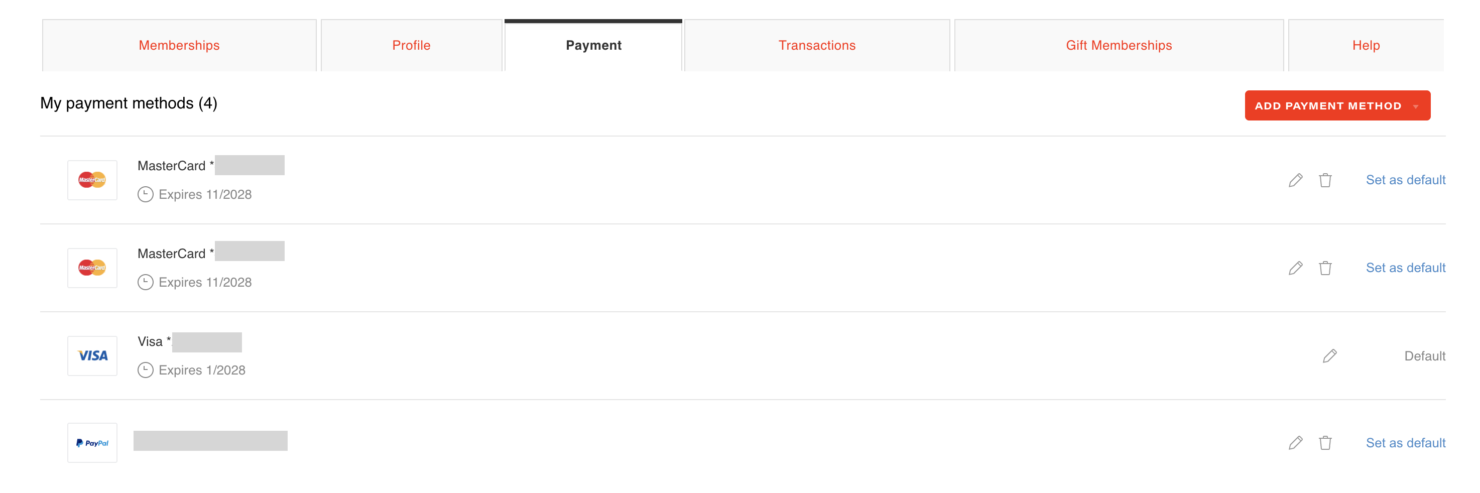 To see a list of your payment methods, to add a new card, or to change your default payment method, go to the 'Payments' tab: